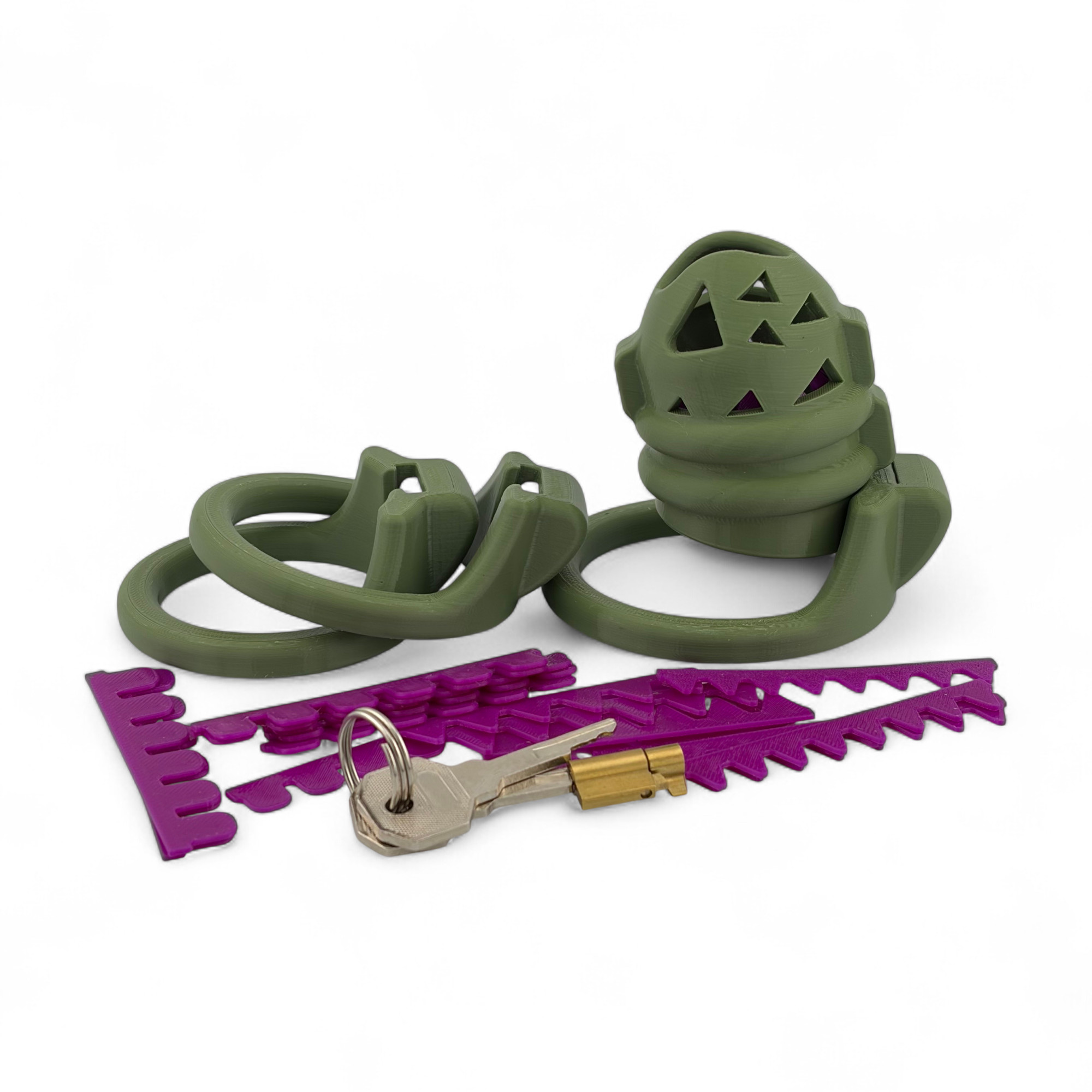 This version of the TameGuard StarterSet consists of an olive green cage (50-65 mm length) with 3 olive green rings (different sizes selectable) and neon purple SoftSpikes.