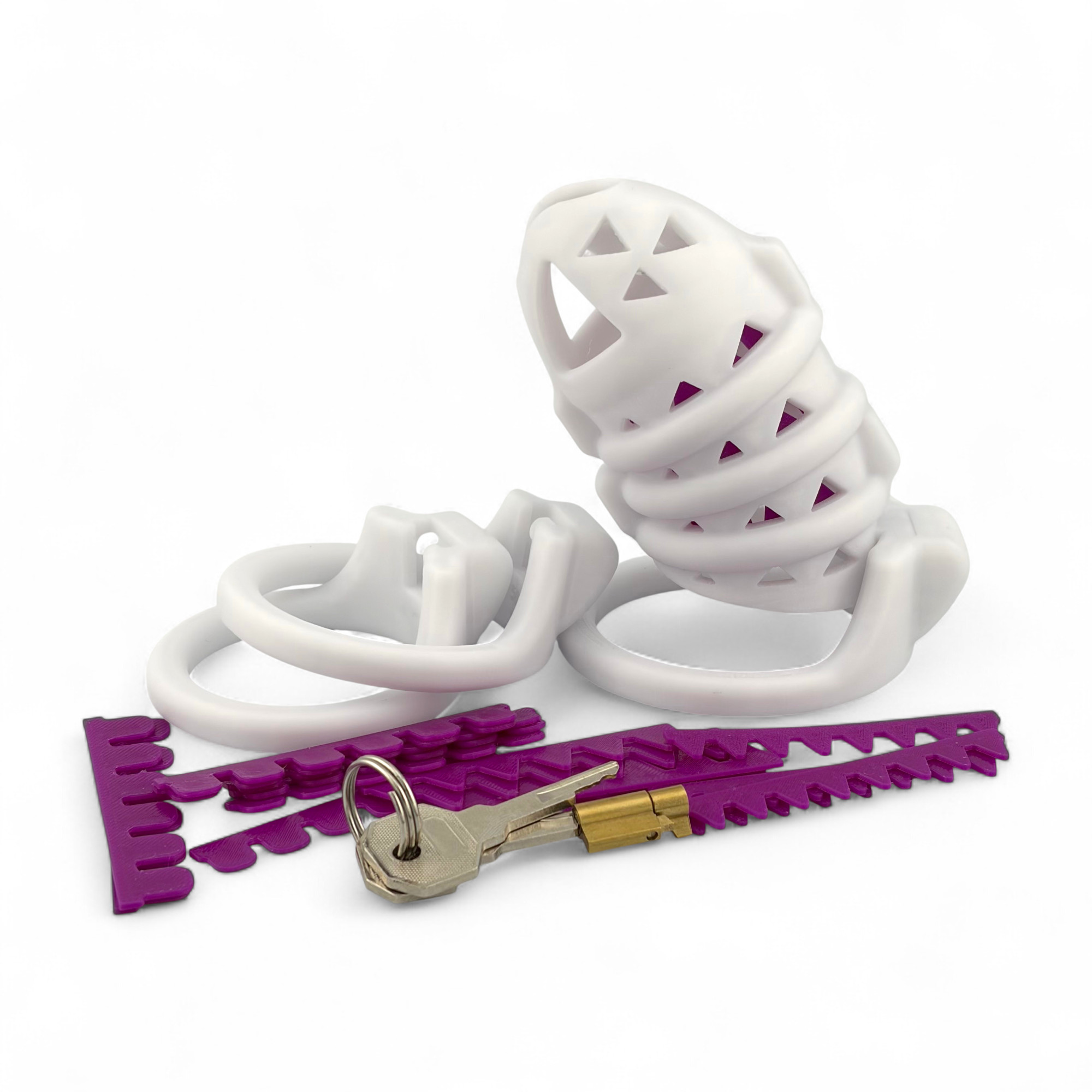 This version of the TameGuard StarterSet consists of a white cage (90-110 mm length) with 3 white rings (different sizes available) and neon-violet soft spikes.