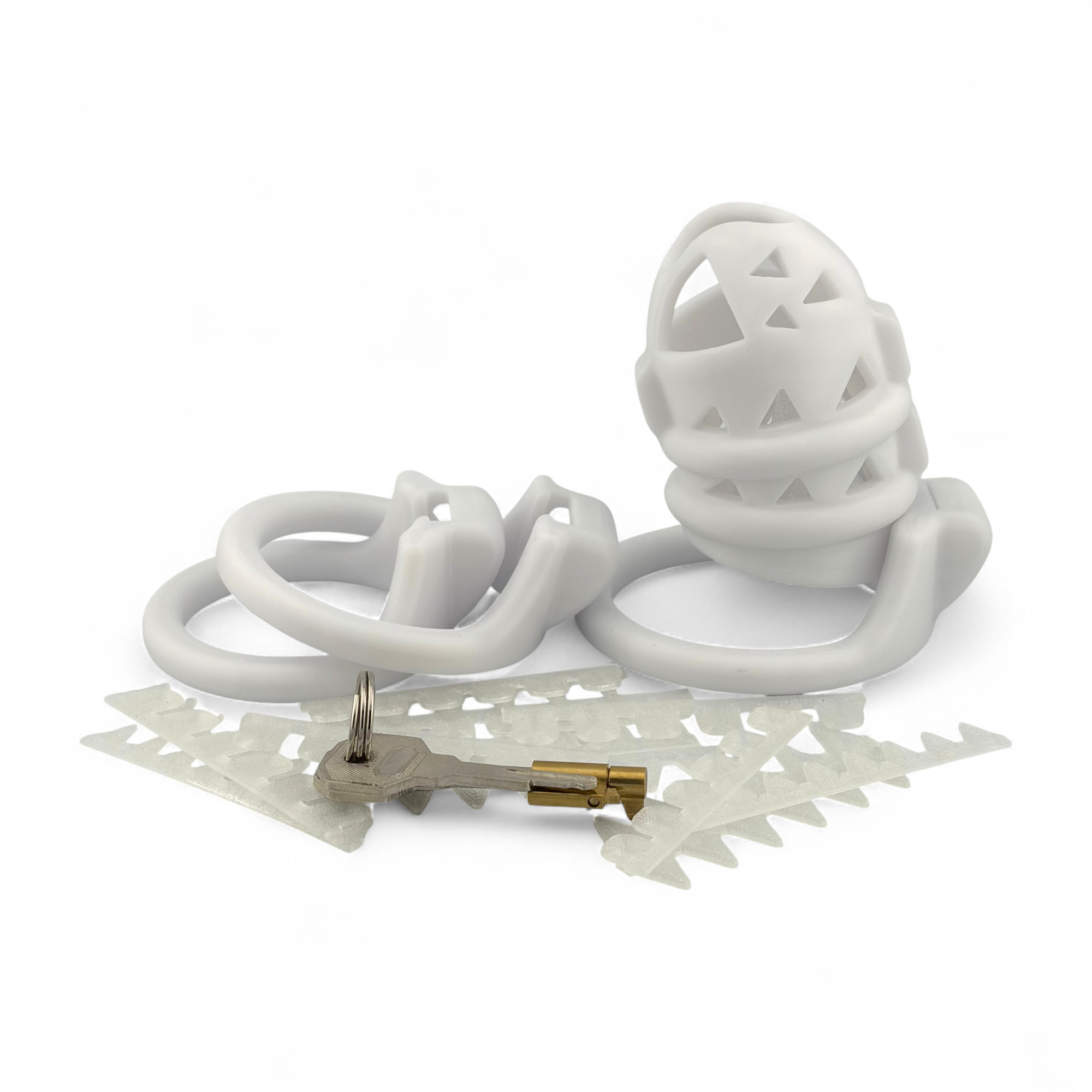 This version of the TameGuard StarterSet consists of a white cage (65-75 mm length) with 3 white rings (different sizes available) and transparent SoftSpikes.