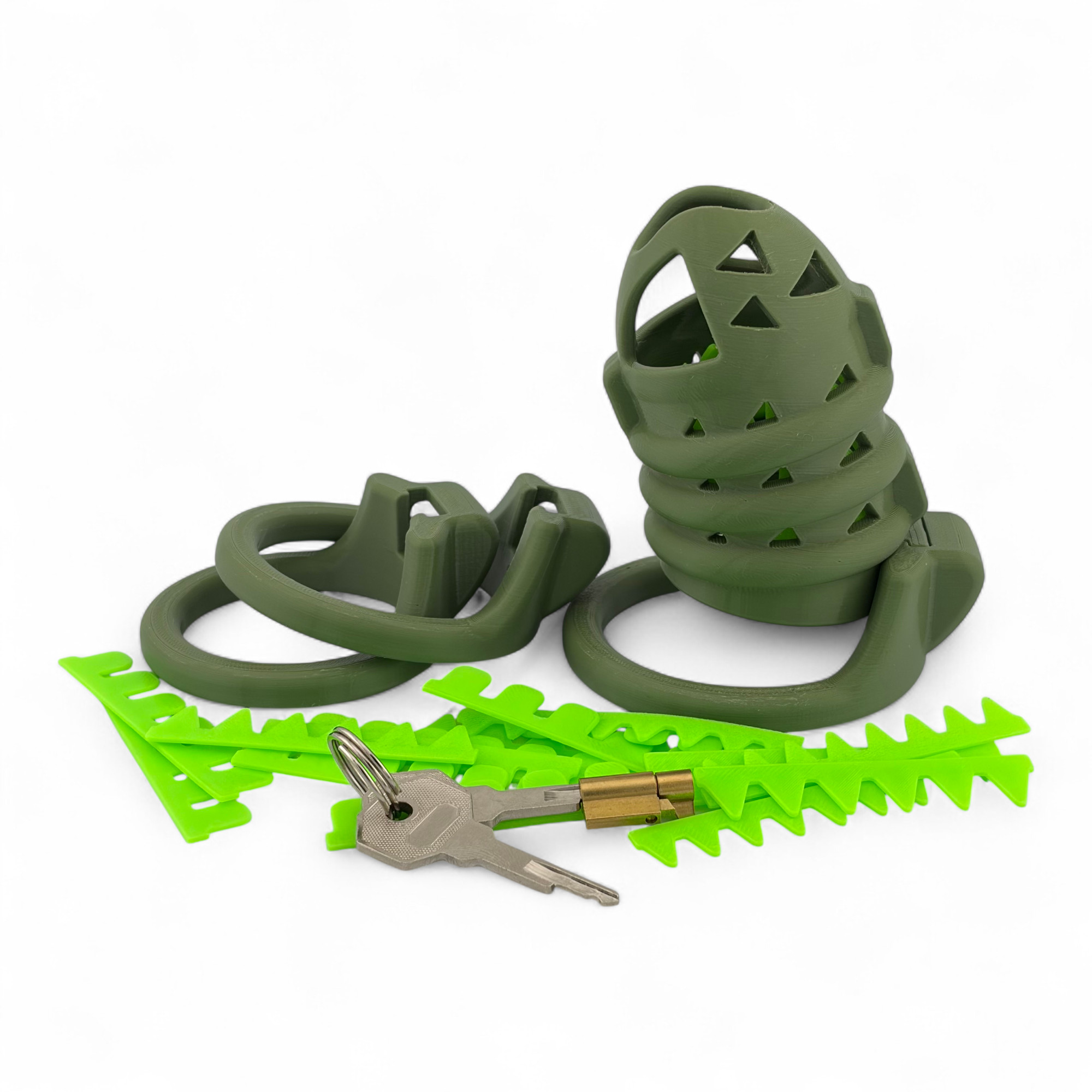 Diese Ausführung des TameGuard StarterSets besteht aus einem olivgrünen Käfig (75-90 mm Länge) mit 3 olivgrünen Ringen (unterschiedliche Größen auswählbar) und SoftSpikes in neon-grün.