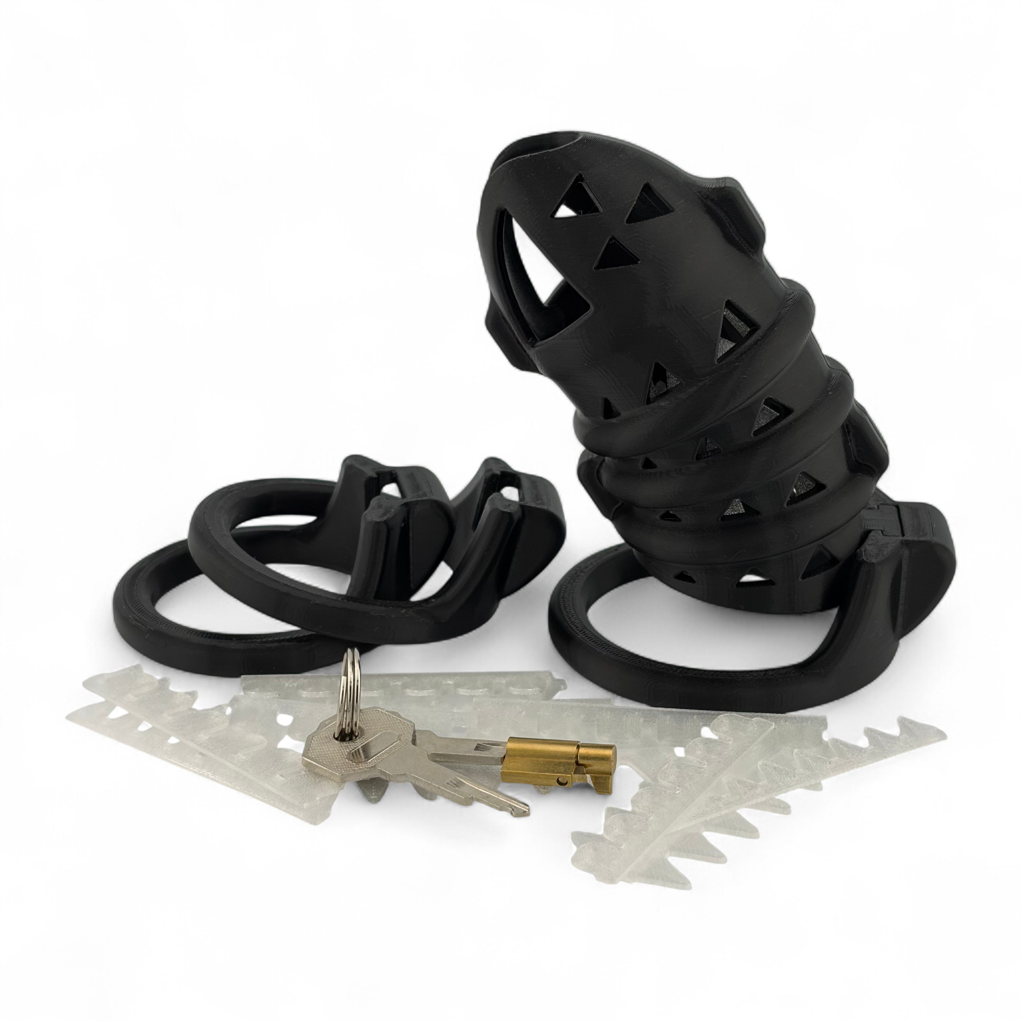 Diese Ausführung des TameGuard StarterSets besteht aus einem schwarzen Käfig (110-125 mm Länge) mit 3 schwarzen Ringen (unterschiedliche Größen auswählbar) und SoftSpikes in transparent.
