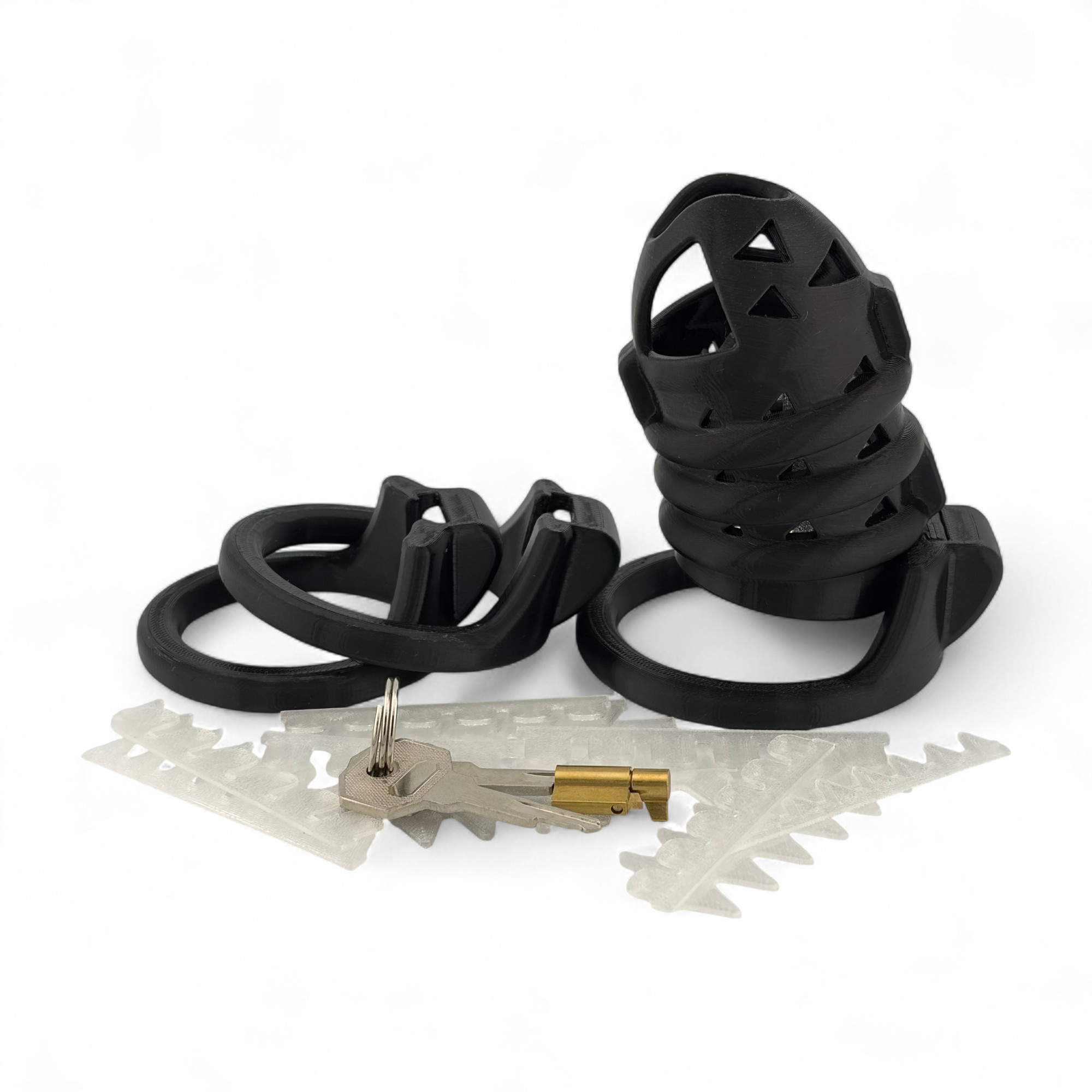 Diese Ausführung des TameGuard StarterSets besteht aus einem schwarzen Käfig (75-90 mm Länge) mit 3 schwarzen Ringen (unterschiedliche Größen auswählbar) und SoftSpikes in transparent.