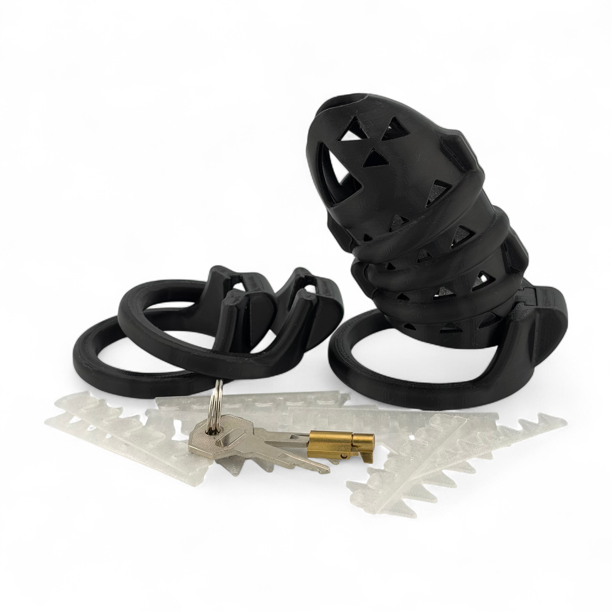 Schwarzer TameGuard-Käfig (90-110 mm Länge), drei Ringe in wählbarer Größe, alle verfügbaren SoftSpike- und SoftSlat-Varianten in transparent und ein Schloss.
